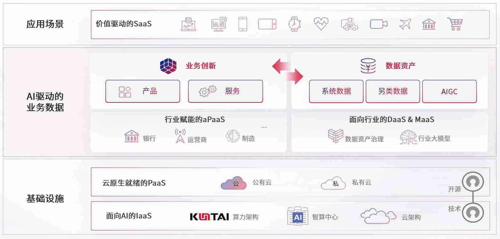 数字时代,,,围绕企业数字化转型的关键要素,,,www.kaiyun.com数码开创性的提出数云融合战略和技术体系框架,,,着力在云原生、、、数字原生、、、、AI原生和信创产业上架构产品和服务能力,,为处在不同数字化转型阶段的快消零售、、汽车、、金融、、、、医疗、、、政企、、、、教育、、、、运营商等行业客户提供泛在的敏捷IT能力和融合的数据驱动能力,,构建跨界融合创新的数字业务场景和新业务模式,,,助力企业级客户建立面向未来的核心能力和竞争优势,,,,全面推动社会的数字化、、、智能化转型升级。。。